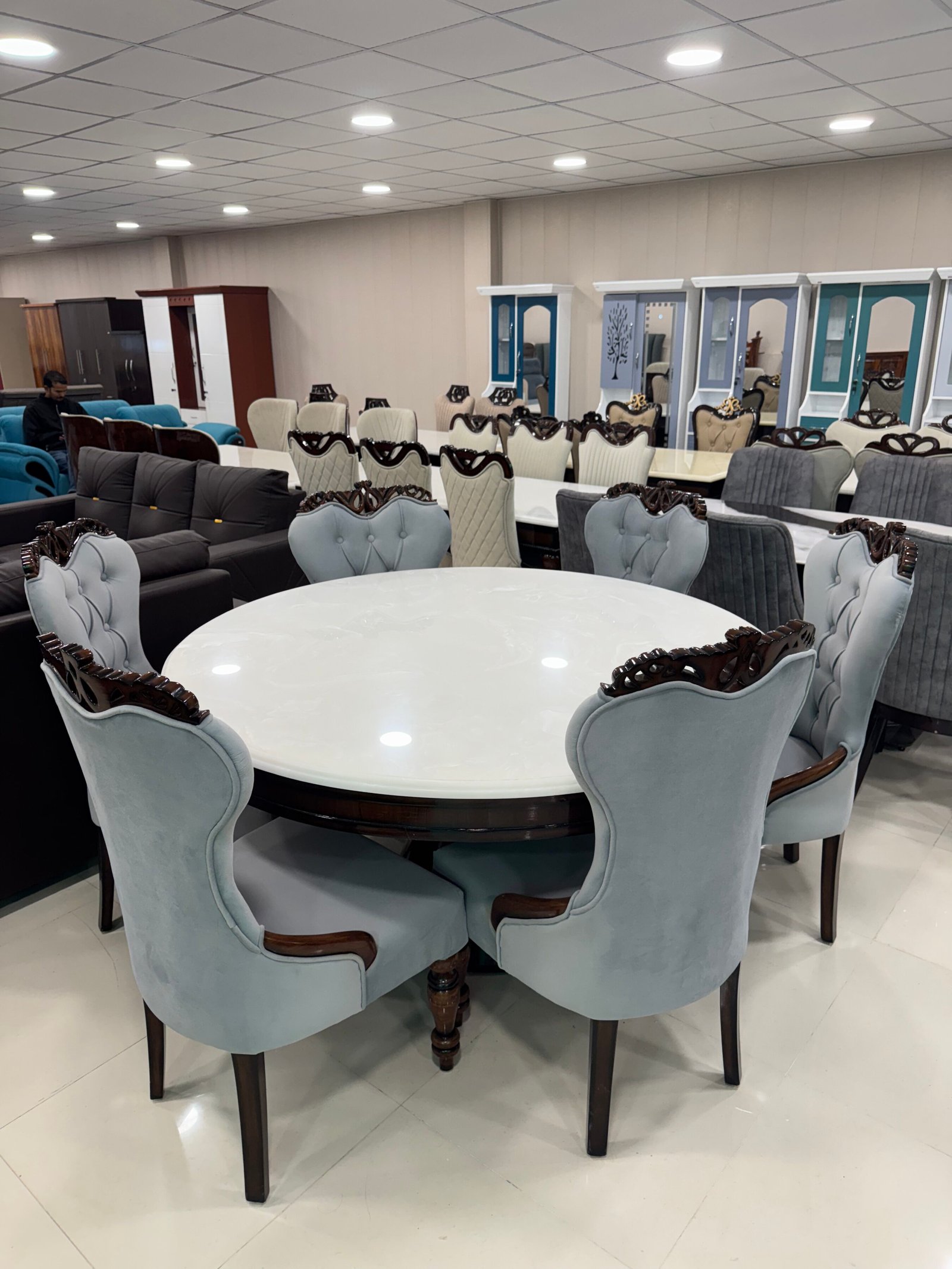 Pure Teak Wood Six Seater Round Dining Table with Onyx Marble